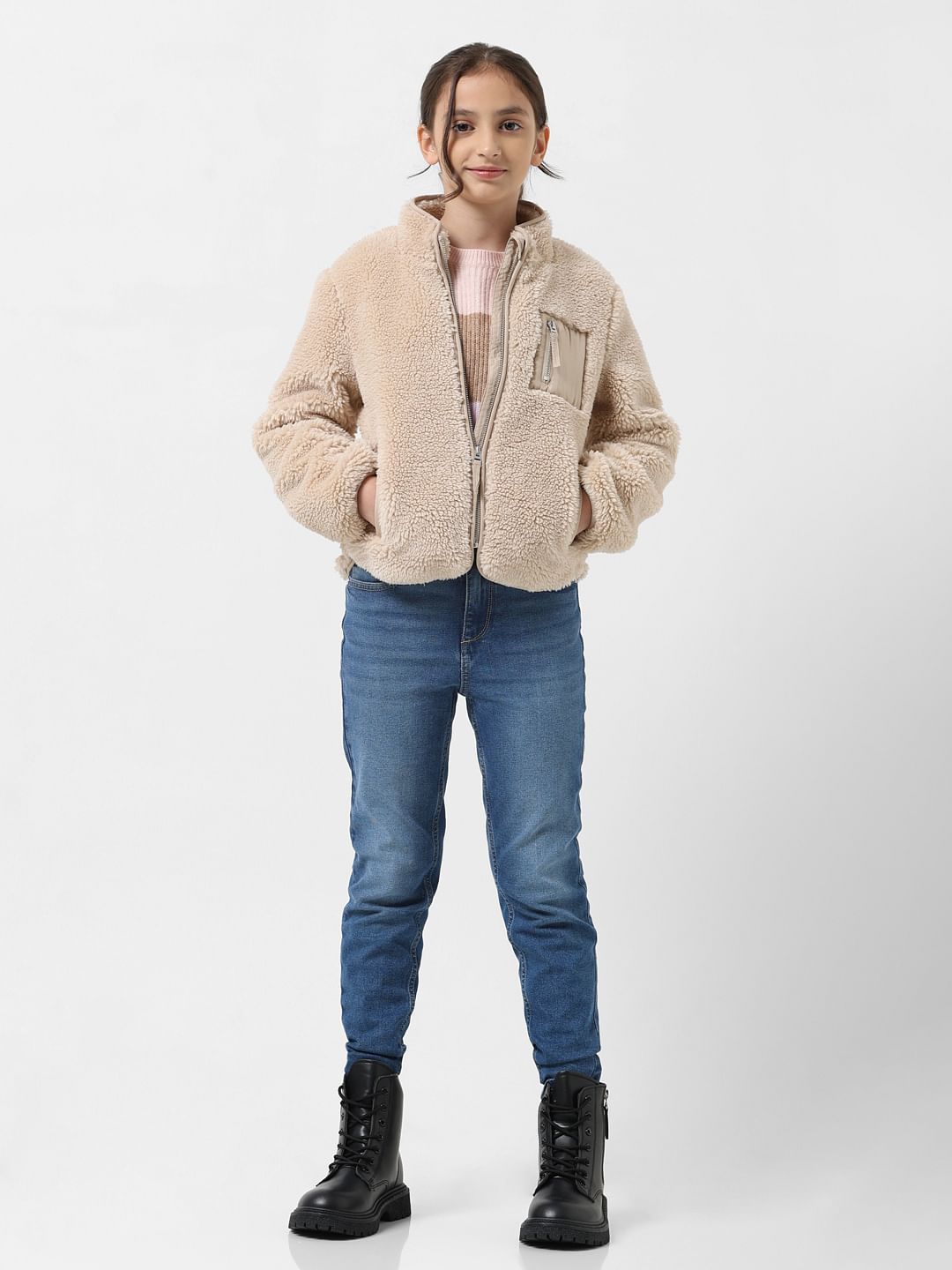 Front open long sleeves sherpa jacket for little girls. Features a front zip pocket, classic front main closure, and high neck collar. Layer it over a top and pair with skinny jeans along with boots for a stylish and cosy winter look!