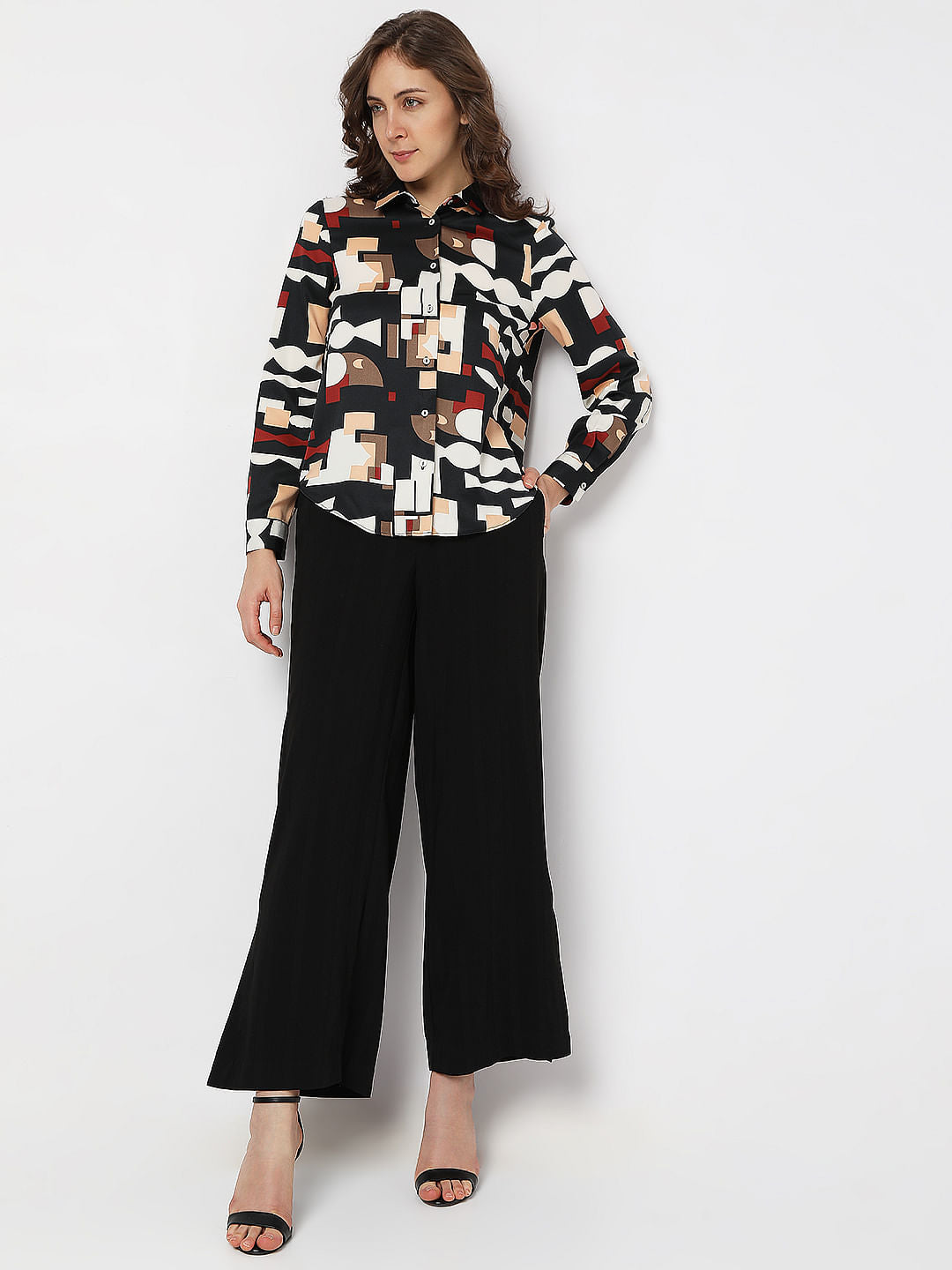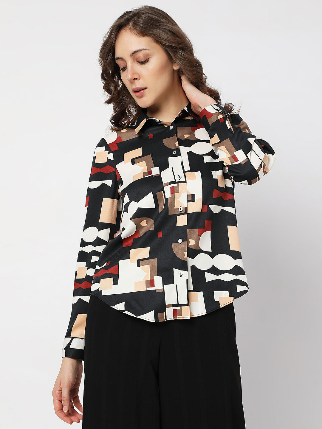 All over geometric printed shirt with long sleeve and a classic front open placket. Pair with black flared trousers and heels for a chic workwear look.