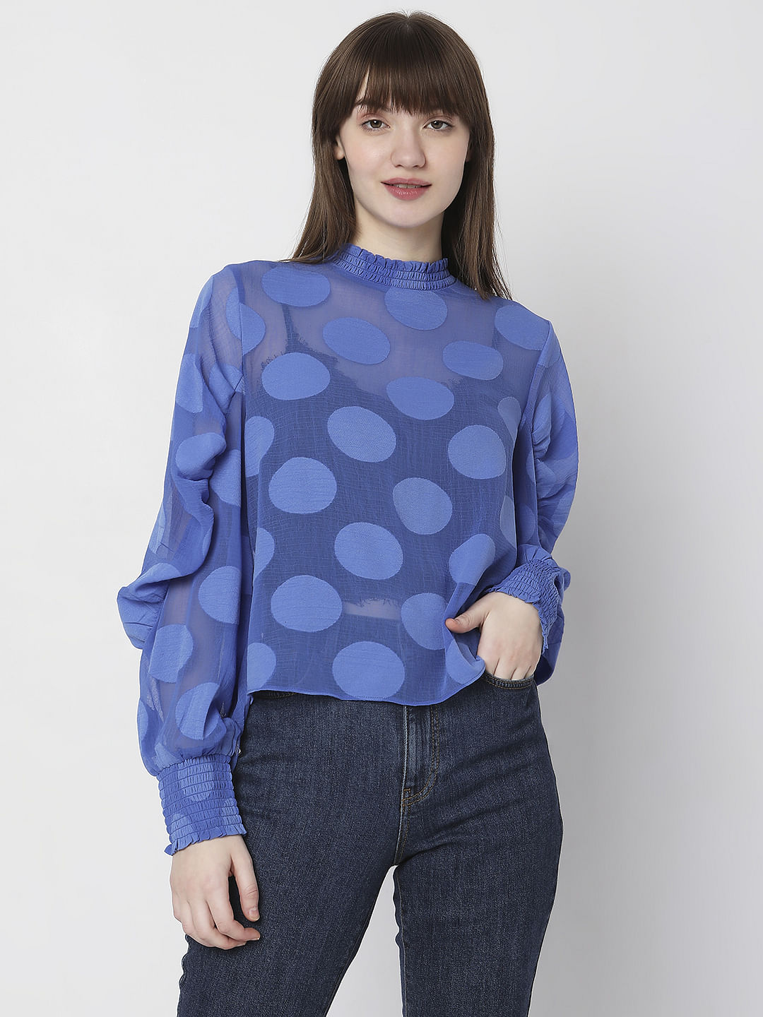 Solid textured top with long puff elasticated sleeves, high neck, elastic detail at neck, and falls at hip. Features a sheer fabric with huge polka dots. Style with denims and heels for a chic AM to PM look.