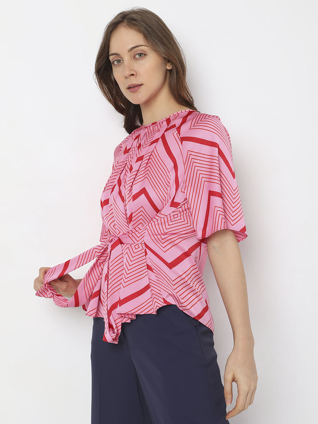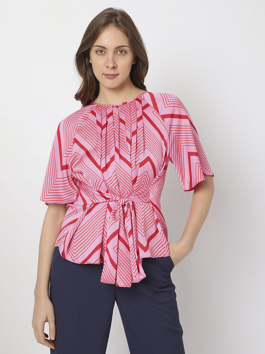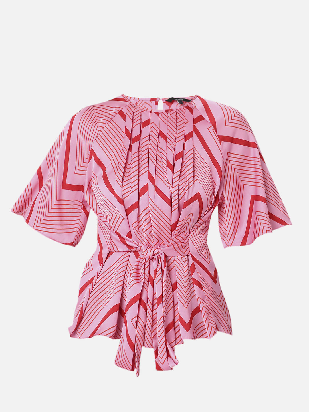 All over printed fit & flare top with pleat detailing at neck, tie-knot at waist, flared sleeves, and falls at hip. Style with cropped trousers and heels for a chic and effortless 9 to 5 look.