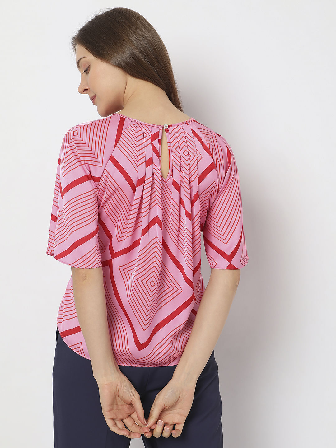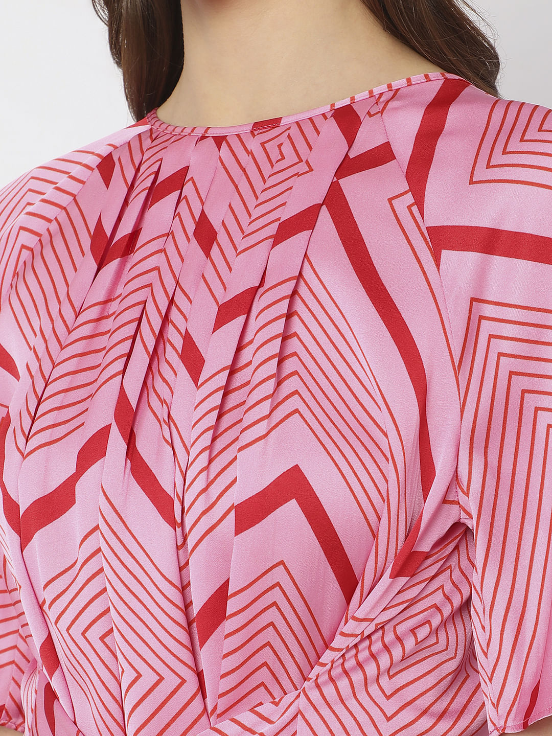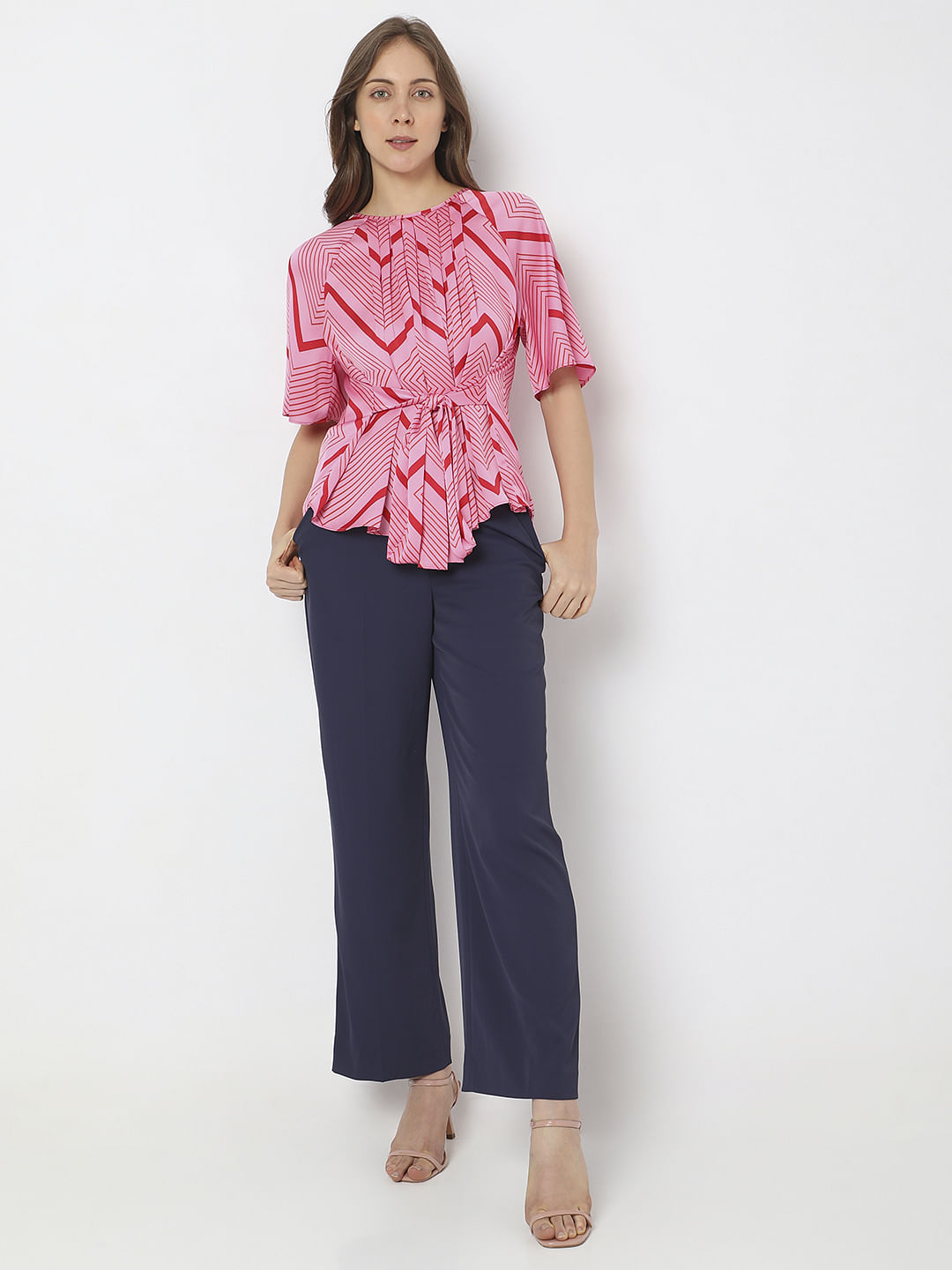All over printed fit & flare top with pleat detailing at neck, tie-knot at waist, flared sleeves, and falls at hip. Style with cropped trousers and heels for a chic and effortless 9 to 5 look.