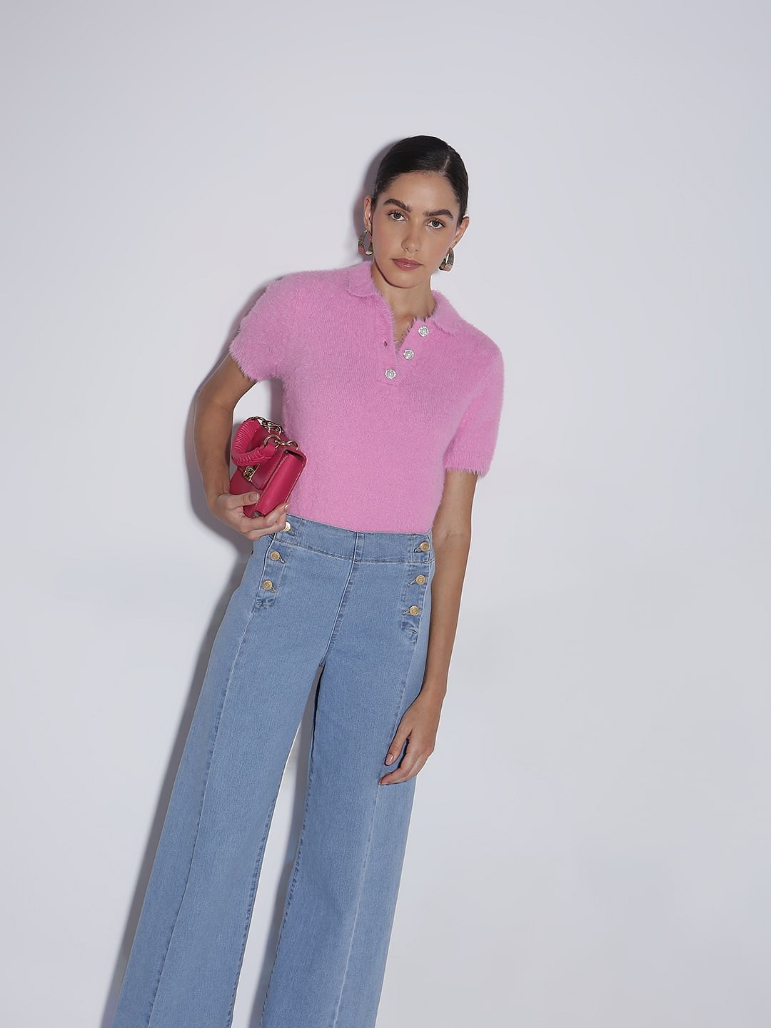 Introducing our fabulous Pink Polo Neck Pullover, the perfect blend of chic and cozy! This must-have wardrobe staple features a stylish polo neck that adds a touch of sophistication to your casual looks. Made from soft, breathable fabric, it wraps you in warmth without sacrificing style. Whether you're lounging at home, heading out for brunch, or layering up for a night on the town, this pullover has got you covered! Pair it with your favourite jeans or a cute skirt for an effortlessly trendy outfit. Get ready to turn heads in this playful pop of pink!