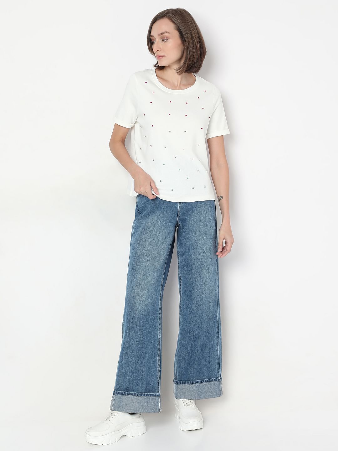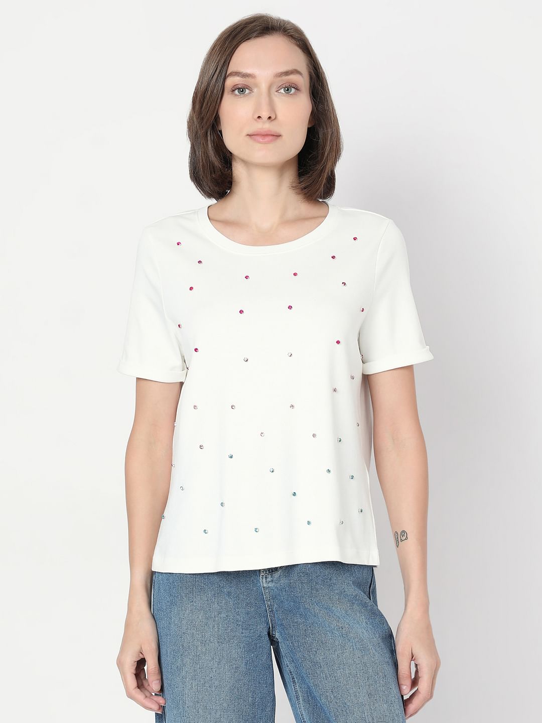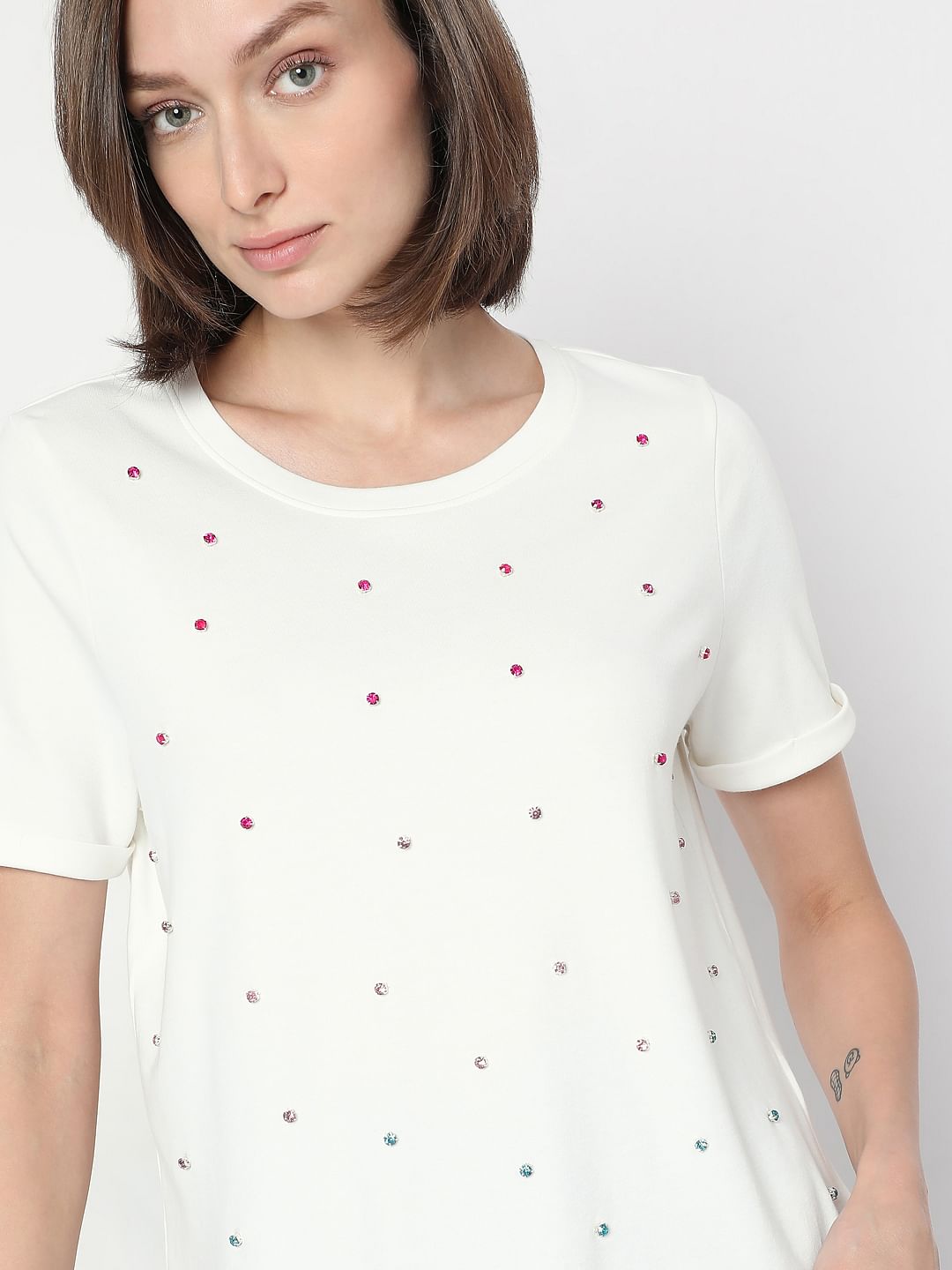 Step into the spotlight with our fabulous White Detail Rhinestone T-Shirt! This eye-catching tee effortlessly combines comfort and style, making it the perfect addition to your wardrobe. Crafted from soft, breathable fabric, it feels as good as it looks. The standout feature? A dazzling array of rhinestones that add just the right amount of sparkle to your everyday outfit. Whether you're dressing it up with a chic skirt or keeping it casual with your favourite jeans, this T-shirt will have you shining bright all day long! Perfect for brunch with the girls or a night out, this tee is your go-to for a little glam without the fuss. Grab yours and let your personality shine!