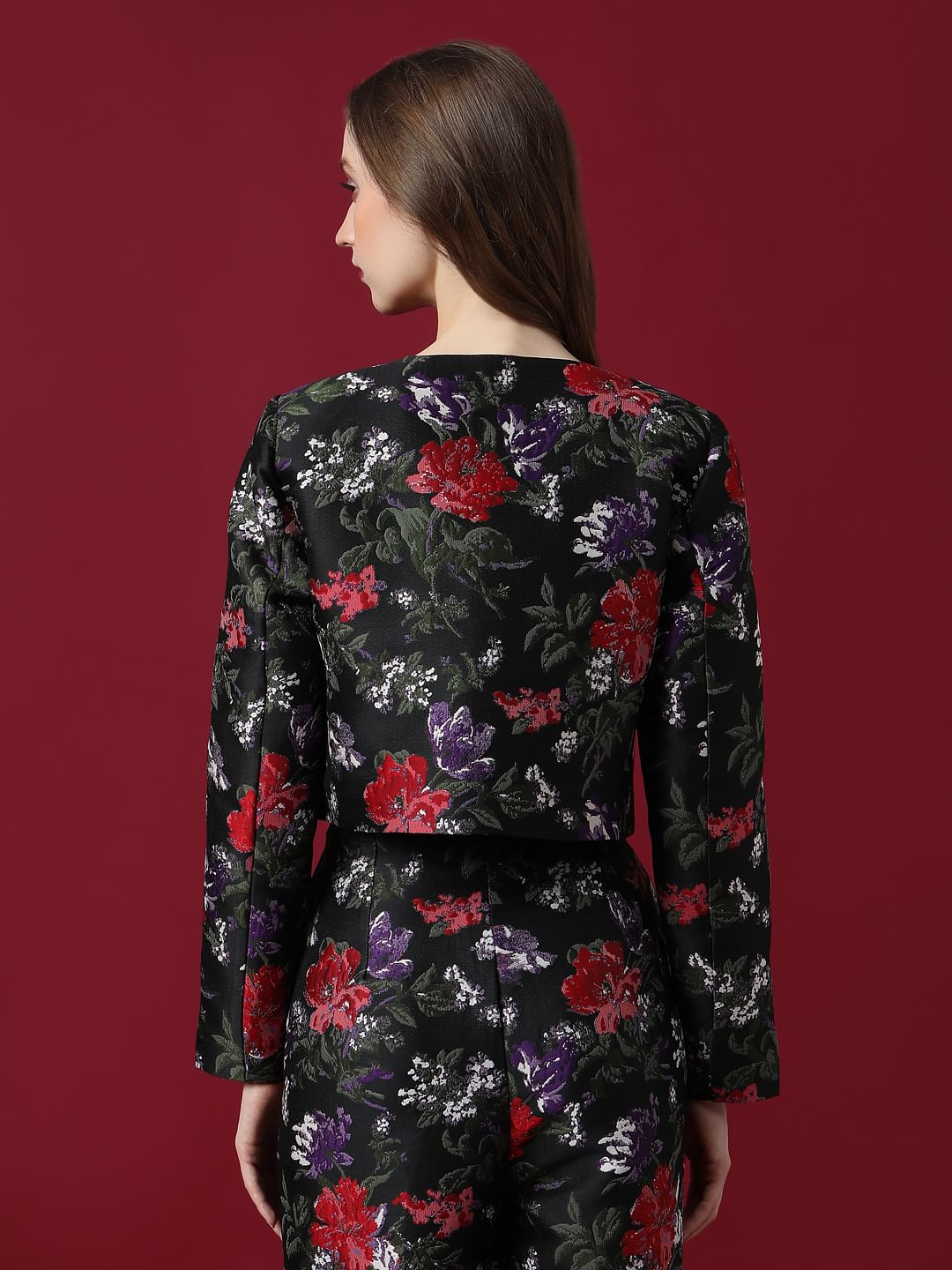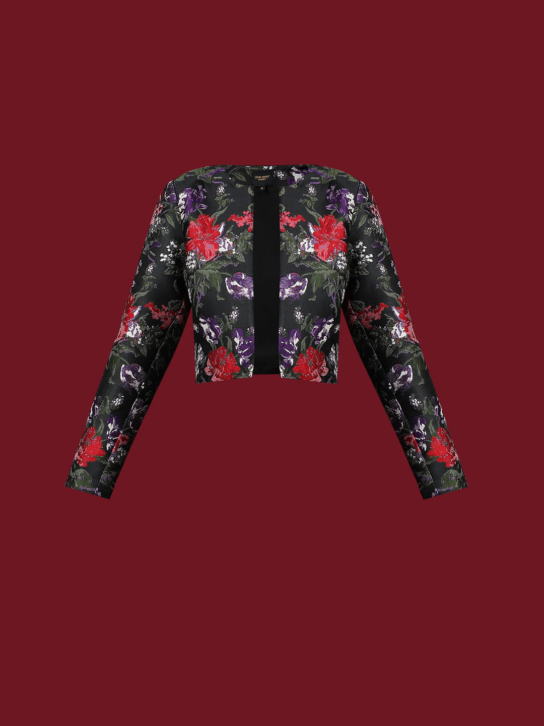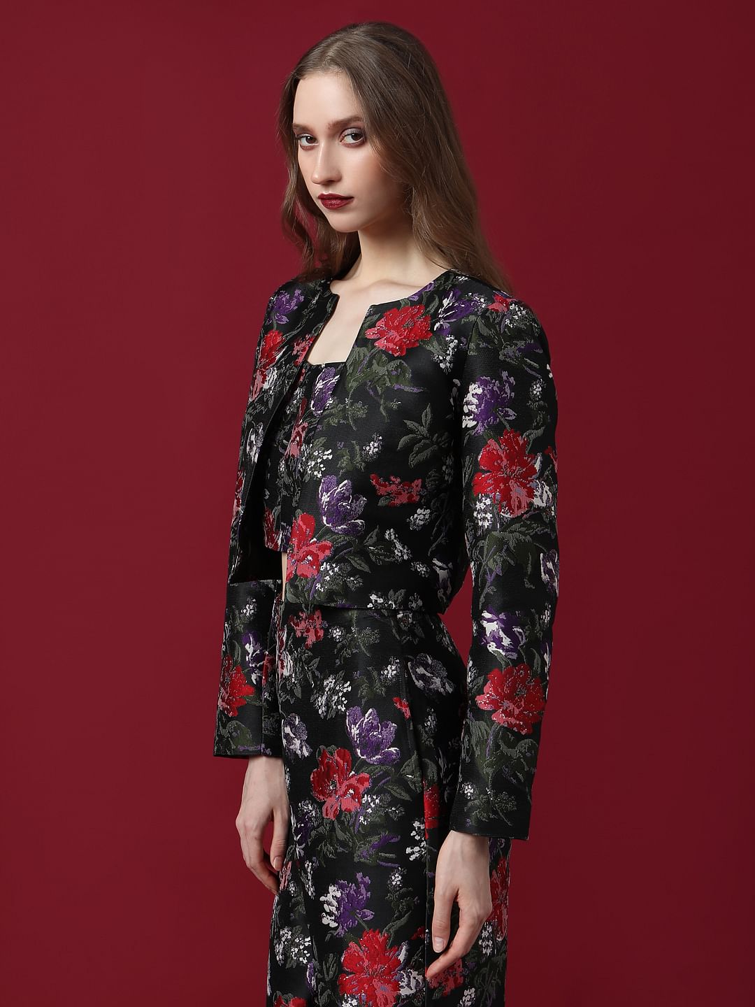 Elevate your wardrobe with this exquisite cropped open jacket, featuring a rich black base adorned with luxurious red and purple floral jacquard. The intricate design showcases an elegant interplay of colors, while the long sleeves and round neck lend a timeless, sophisticated silhouette. Collarless for a clean, modern finish, this jacket effortlessly balances classic femininity with a bold statement look. Style Note: Perfect for both day and evening wear, this jacket pairs beautifully with tailored trousers or a sleek midi dress for a chic, polished ensemble.