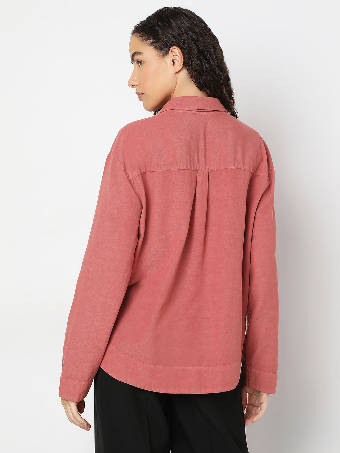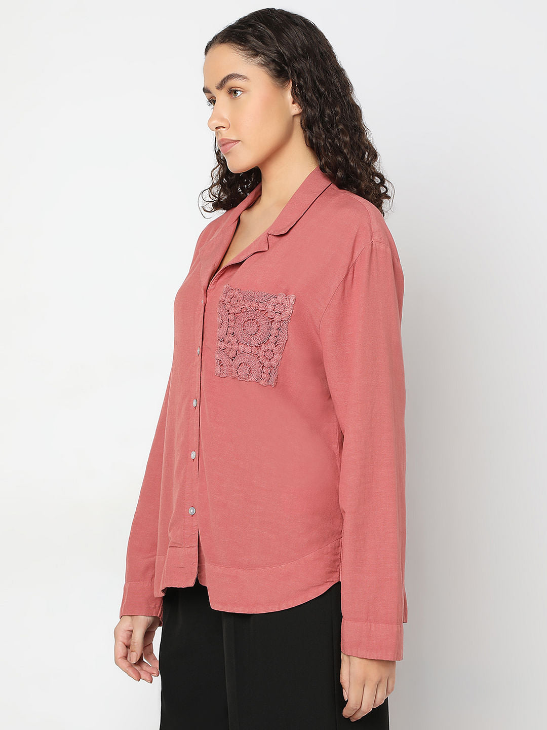 This elegant rose-coloured shirt features a full sleeve design with cuffed details and a relaxed fit for effortless sophistication. The spread collar adds a refined touch, while the front chest pocket, adorned with delicate lace detailing, enhances its charm. The shirt falls gracefully below the hip with a curved hemline, offering both style and comfort in one versatile piece. Perfect for any occasion.