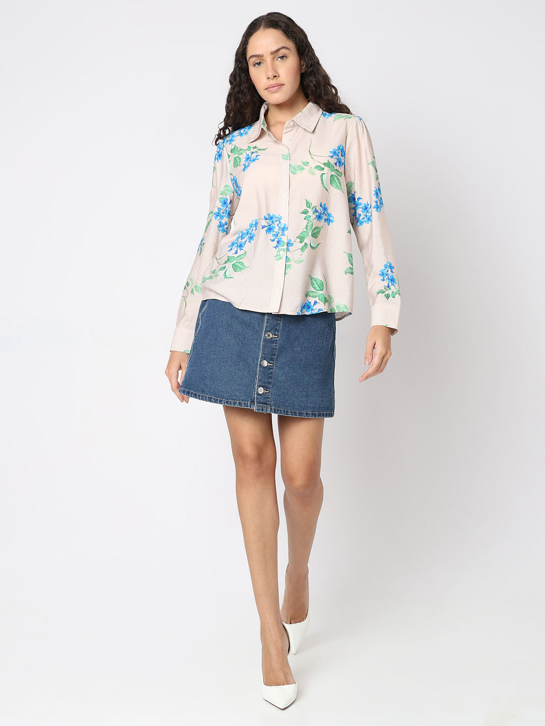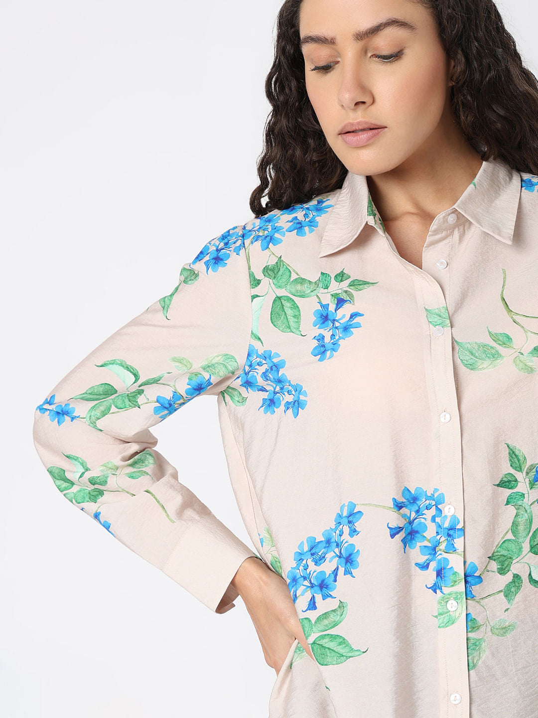 This elegant floral print shirt features a full sleeve design with cuffed sleeves and a flattering curved hemline. The front button closure adds a refined touch, while the spread collar enhances its classic appeal. With its length falling just below the hip, this shirt offers a graceful, versatile silhouette perfect for any occasion.