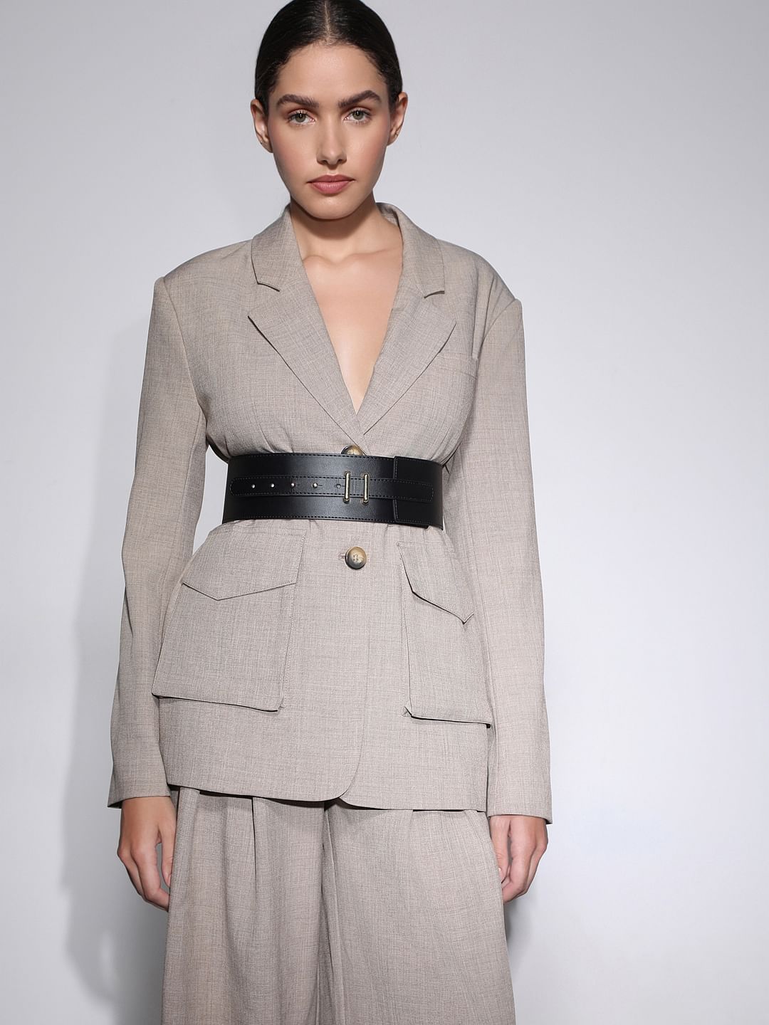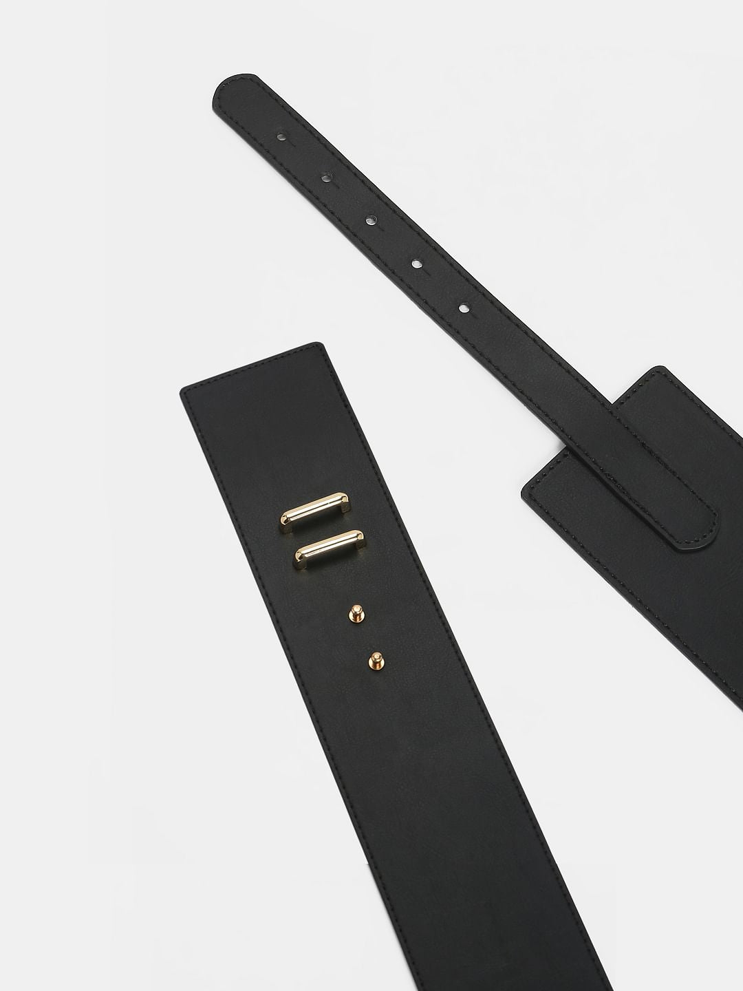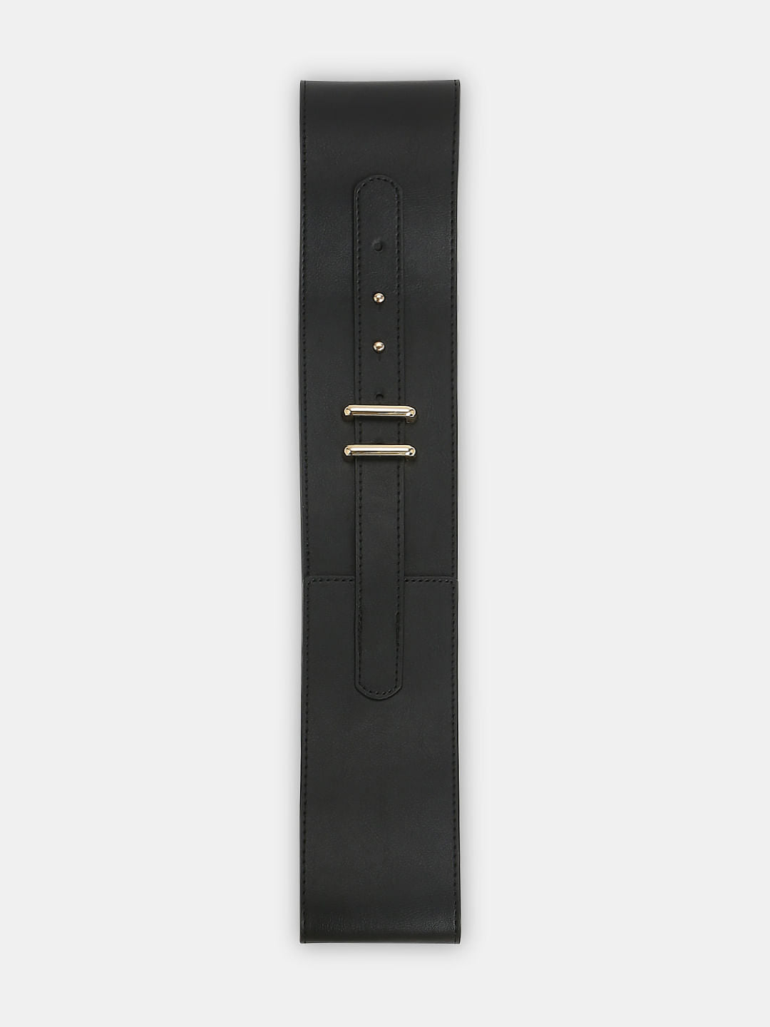 Classic and stylish jet black wide belt for dresses , features a golden trim with tiny holds for adjustable fit.