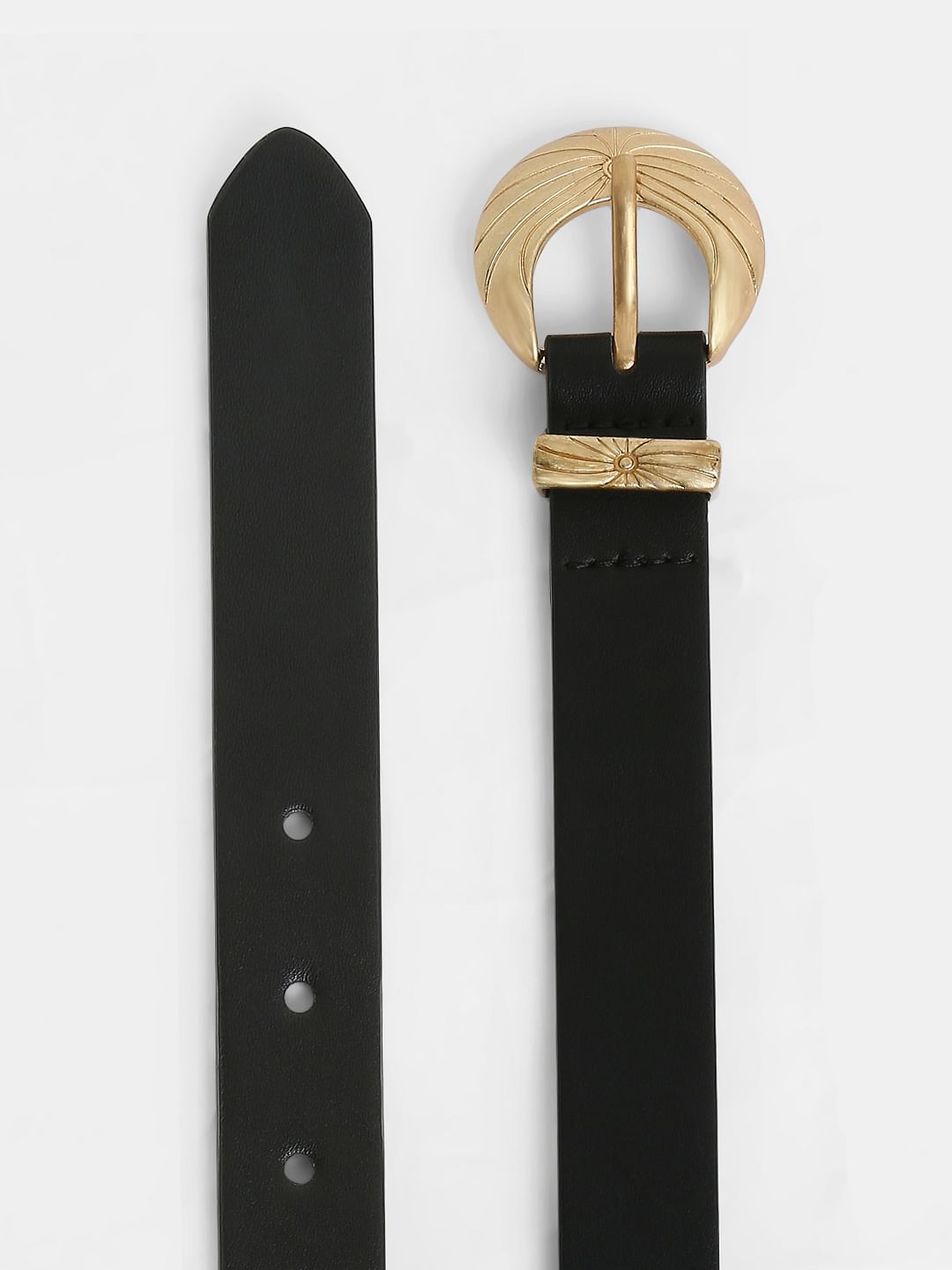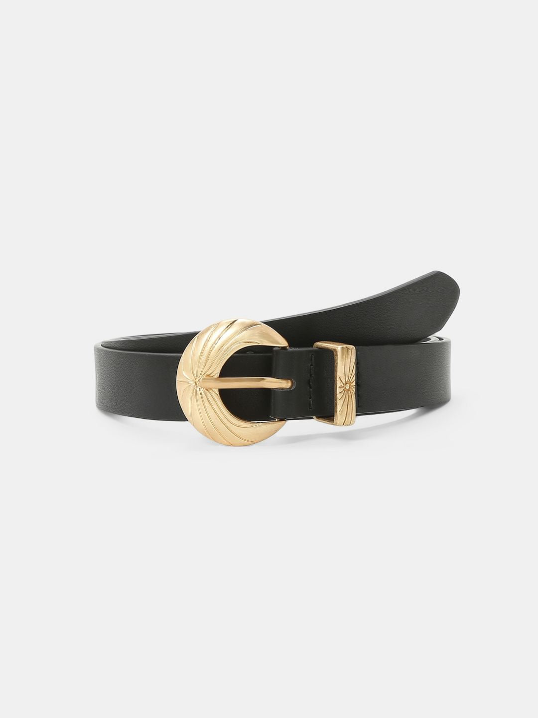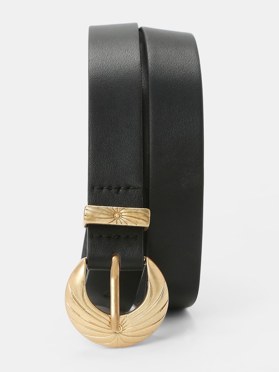 Classic and stylish belt features a high fashion golden buckle detail with tiny hoops for flattering fit