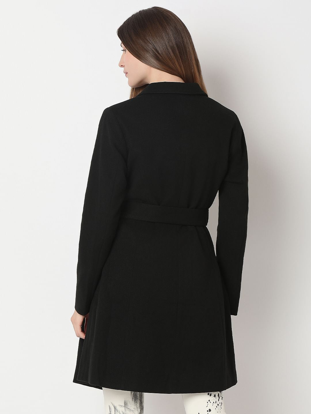 This black felt overcoat offers a refined, regular fit with a notched lapel collar and long sleeves. Designed with a front-open style, it features two functional pockets and a self-fabric belt for added structure. The straight hem completes the look, making it a timeless addition to your wardrobe.