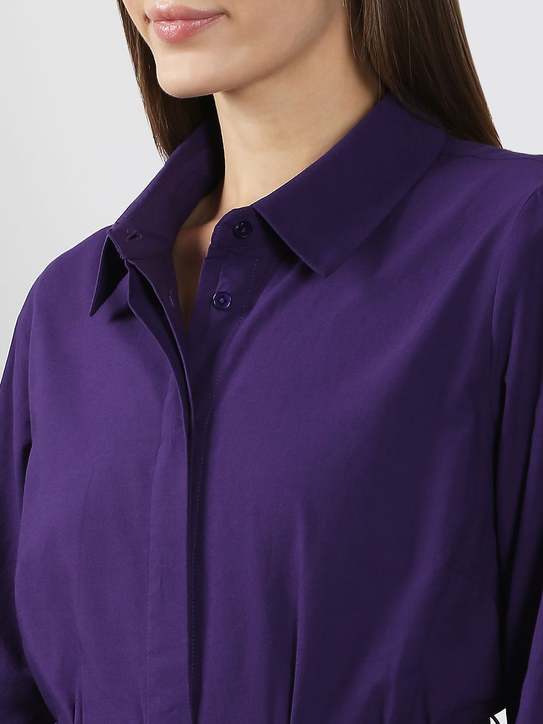This purple shirt dress features long bishop sleeves, intricate schiffli detailing, and a classic shirt collar. The fit-and-flare silhouette hits just above the knee, cinched at the waist with a tie-up belt for a flattering finish. Perfect for adding a touch of elegance to your everyday look.