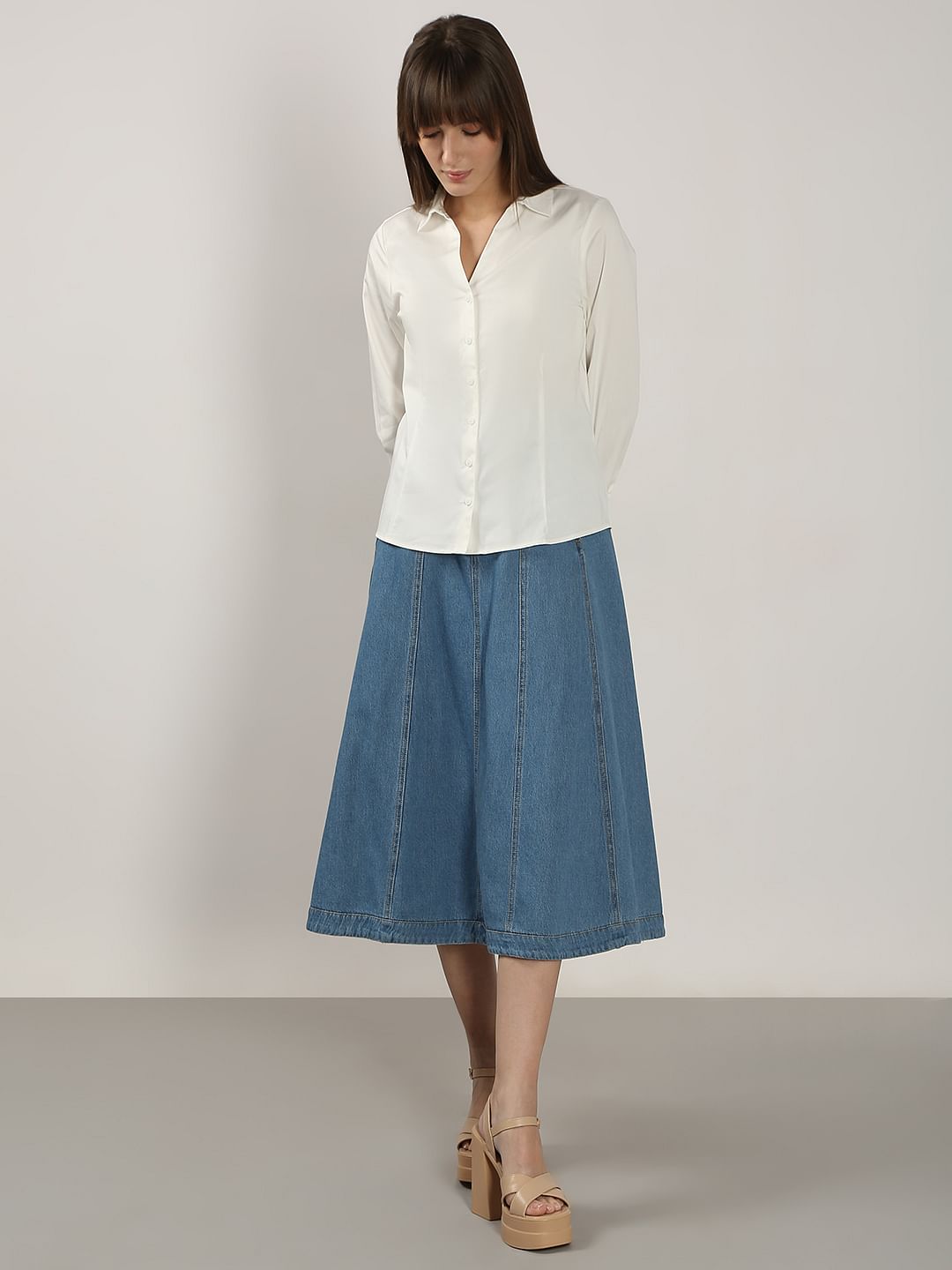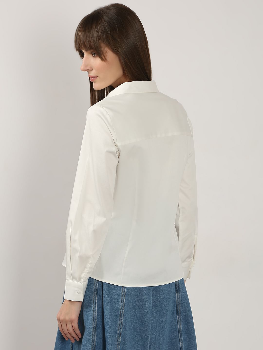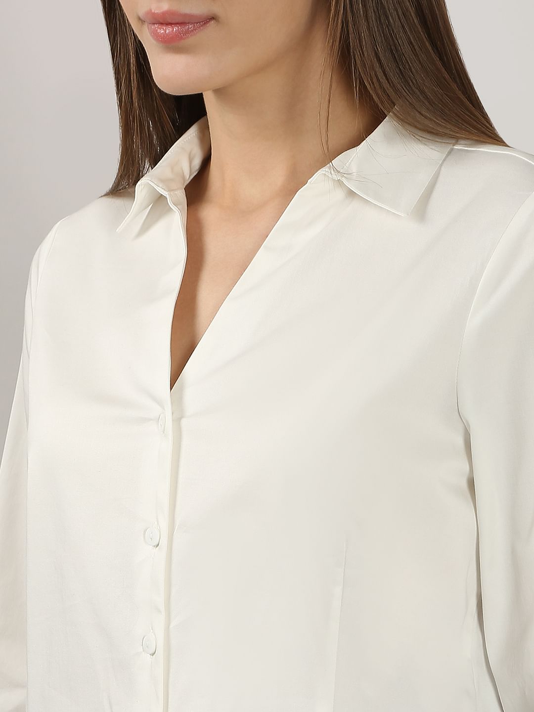 Elevate your everyday workwear style with this timeless white shirt. Designed with a classic V-neck collar, full sleeves with cuffs, and a front button-down placket, it offers a polished look. The princess lines and back yoke ensure a flattering fit, while the regular silhouette gracefully falls over the waist. Perfect for effortless elegance!
