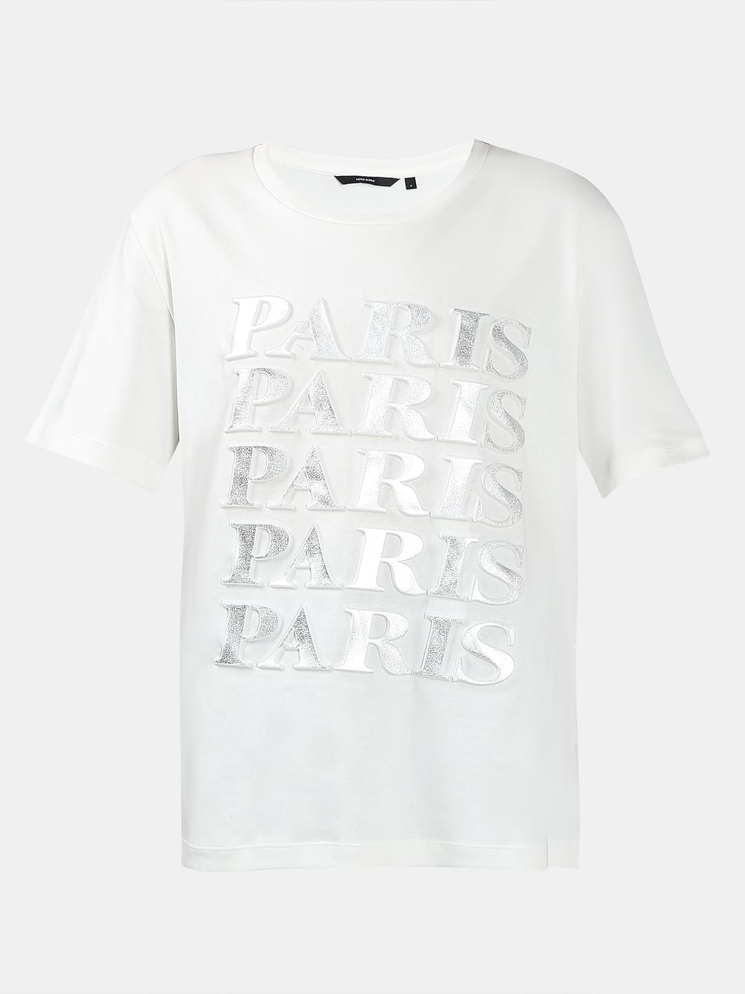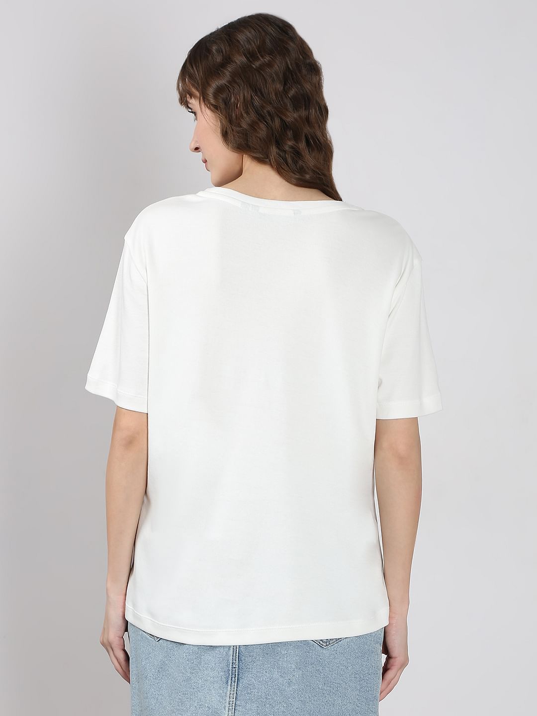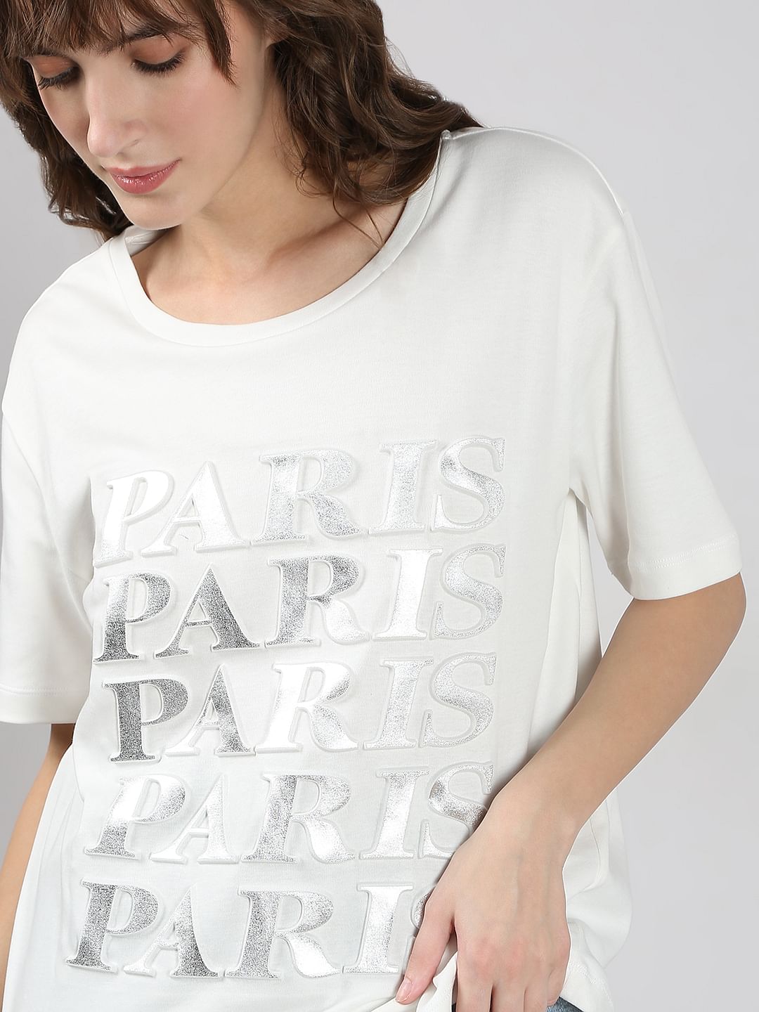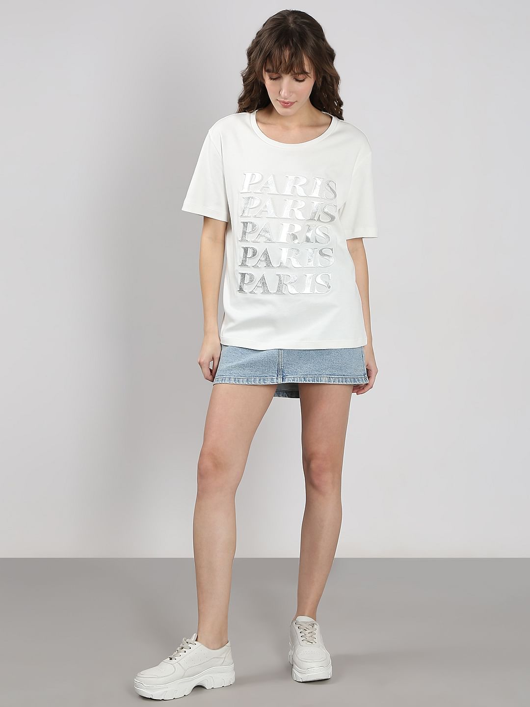 Upgrade your casual style with this chic white T-shirt from VERO MODA. Featuring a round neck, half sleeves, and a regular fit, it’s designed for effortless comfort. The front panel shines with silver typography print, adding a touch of statement flair. Falling just over the hip, it’s perfect for everyday wear.