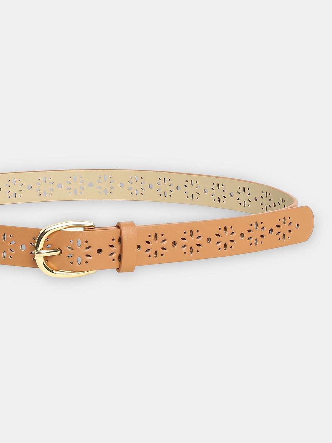 Brown Cut-Out Detail Jeans Belt with golden buckle.