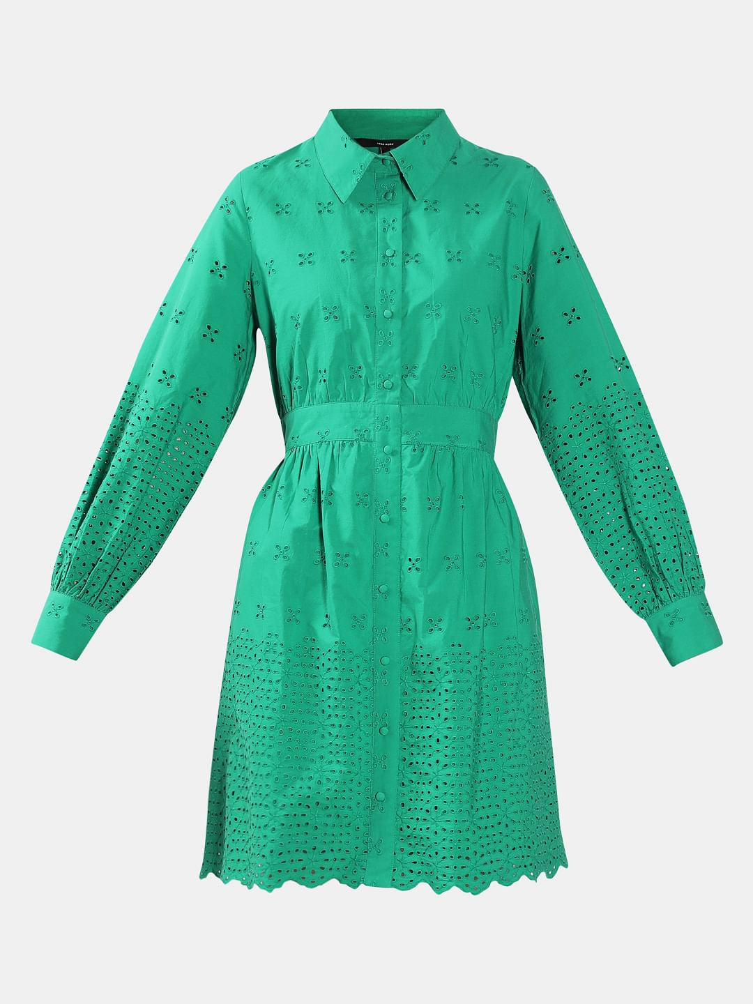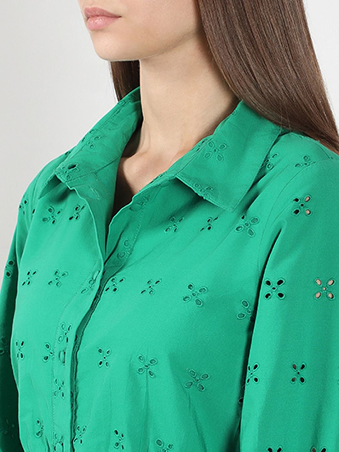 Effortlessly chic and timeless, this green shirt dress is a wardrobe must-have. Featuring a standard collar, front button closure, and full sleeves with cuffs, it blends classic details with modern charm. The intricate cutwork, triangular hem, and midi length add a stylish edge, while the empire waist with an elasticated back ensures a flattering fit-to-flare silhouette.