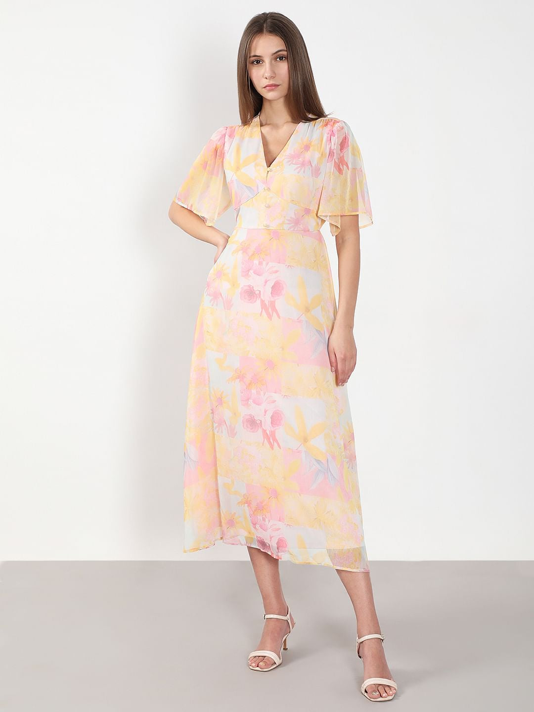 Embrace effortless elegance in this printed V neck dress. Designed with a flattering V-neckline, half flared sleeves, and delicate button detailing till the empire line, it offers a timeless charm. The regular and flowing silhouette make it a perfect choice for any occasion.
