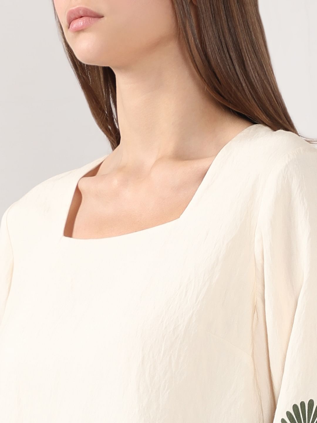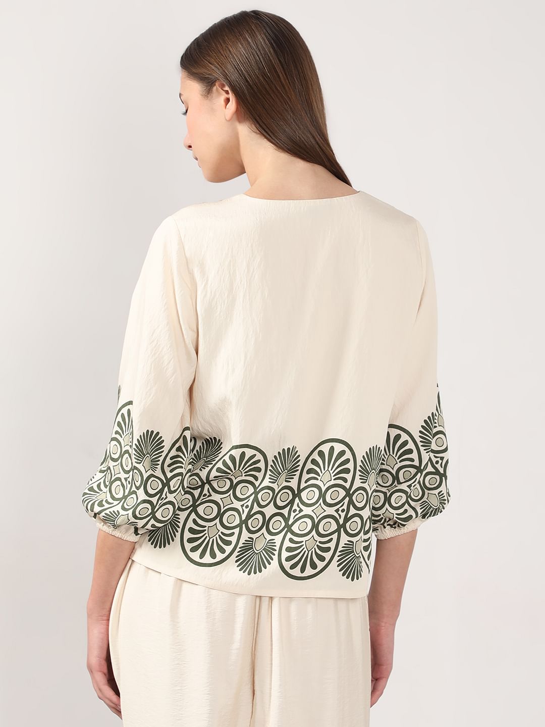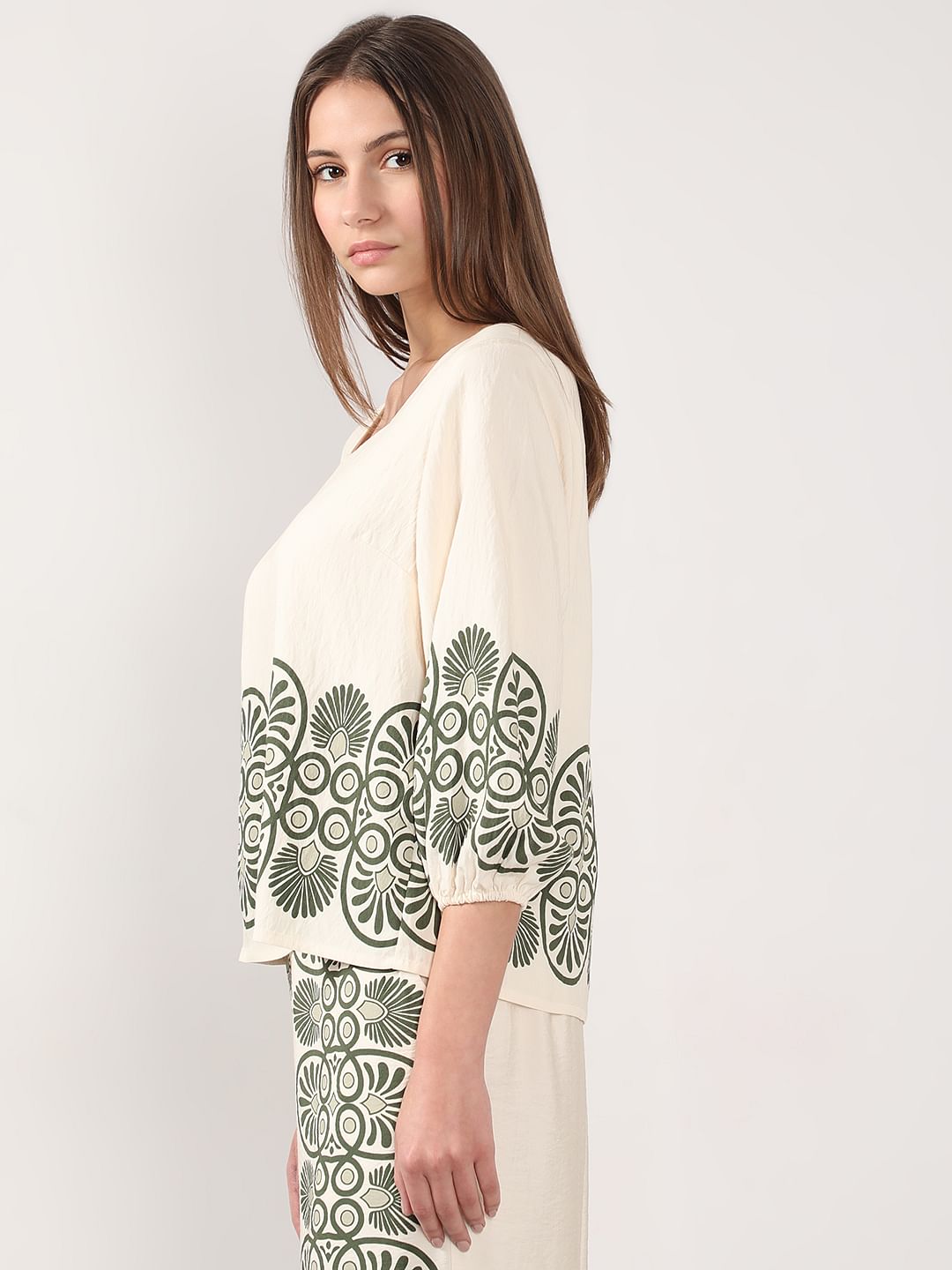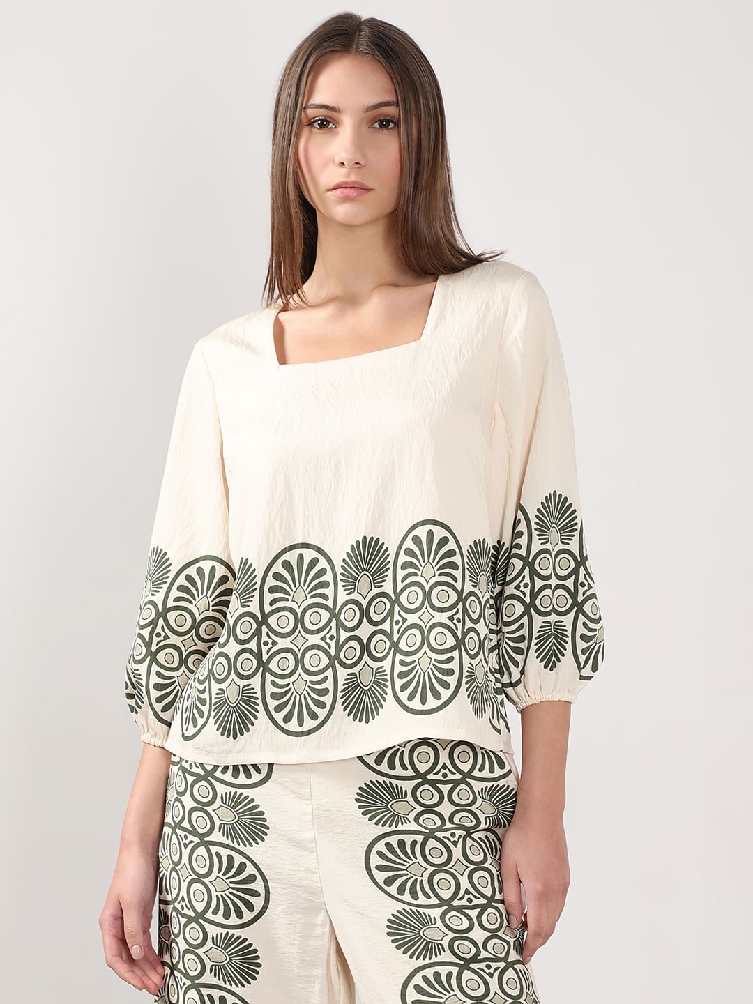 Effortlessly chic, this ecru top features a square neck, 3/4 sleeves, and an all-over green print. Designed in a regular fit, it falls gracefully over the waist—perfect for a stylish, everyday look.