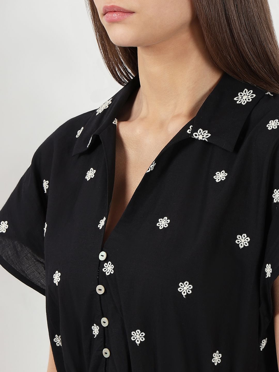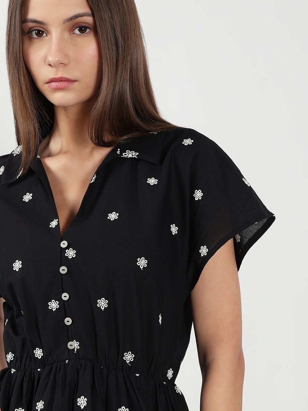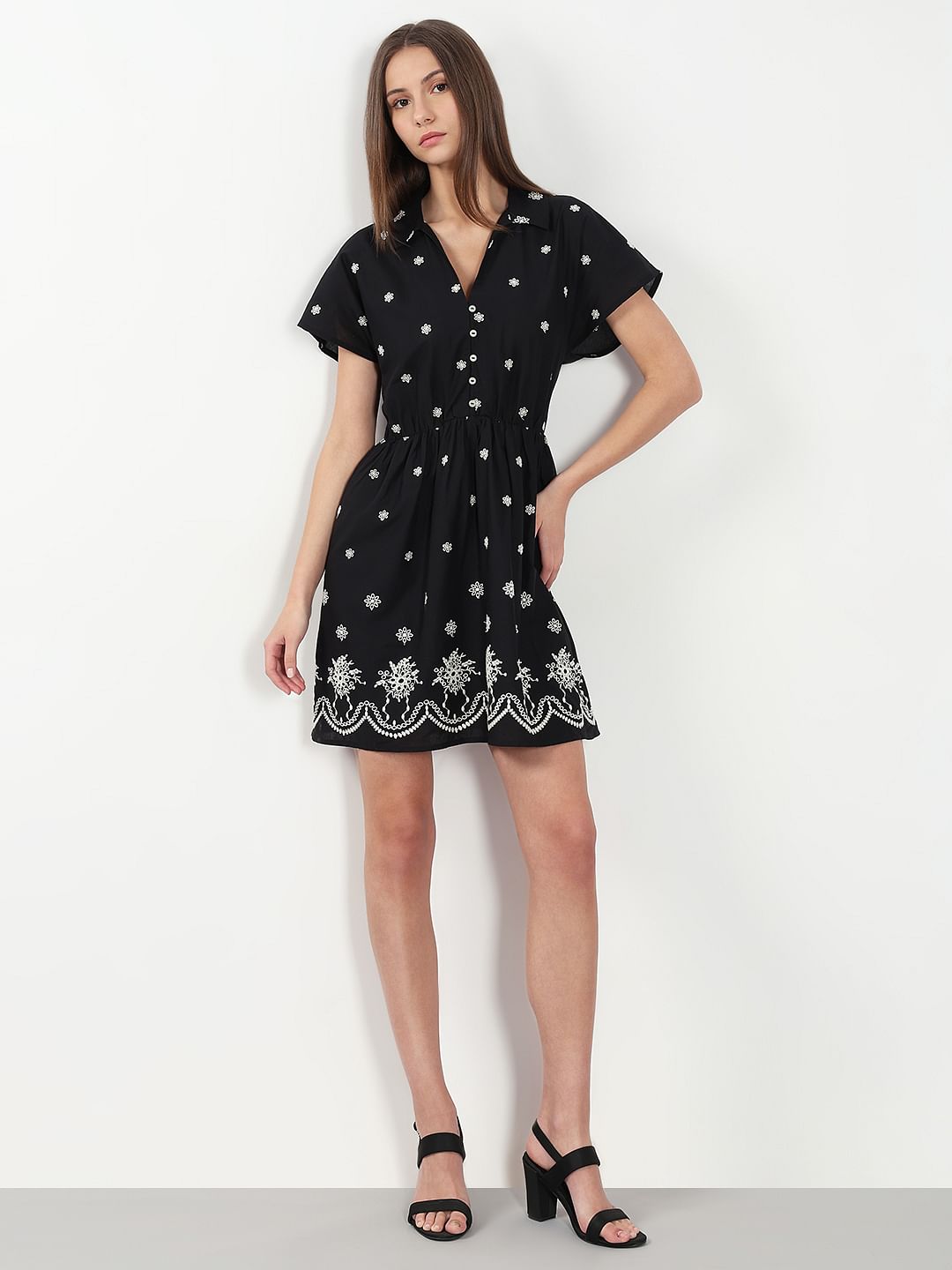 A chic black mini dress with an all-over white print, featuring 1/4th flared sleeves and a front button closure till the waist. Designed with an elasticated waist for a flattering fit-and-flare silhouette, it falls stylishly over the thigh—perfect for effortless everyday style.