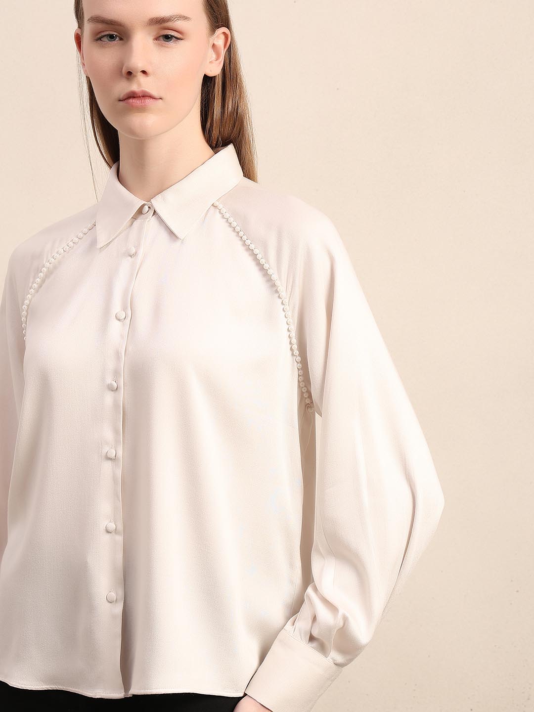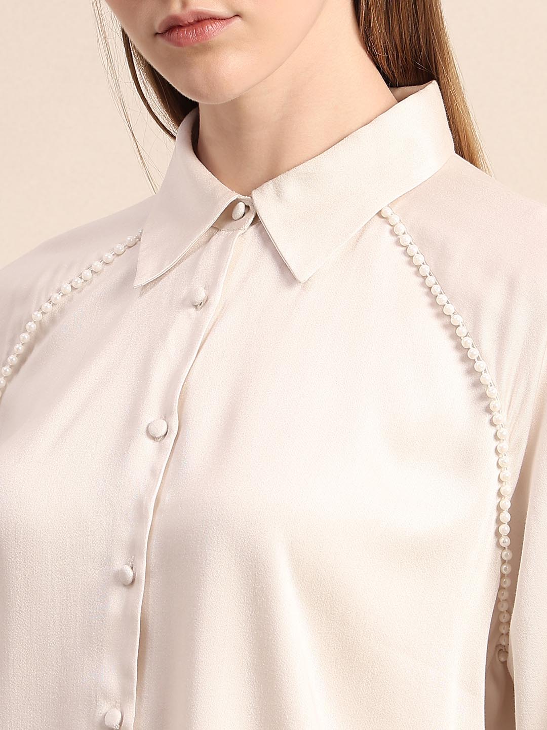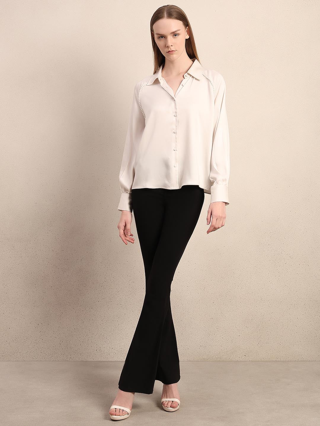 Elevate your everyday style with this white shirt featuring a classic collar, pearl embellishments, and gathered cuffs. Designed in a regular fit for effortless elegance.